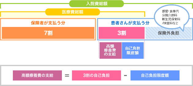 高額療養費とは、健康保険が適用される治療費(医療費総額)のうち患者さんが支払う分が、自己負担限度額を超えた場合に支給される医療費です。