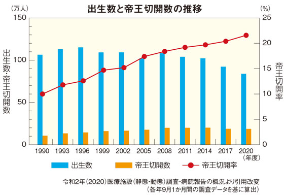 日本で「帝王切開」により出産した人は、2020年の統計では、総出生数およそ84万人のうち22.4%にあたる約19万人と推定されています。つまり妊婦さんの約5人に1人が帝王切開により出産していることになります。 また、出生数自体は減少しているにもかかわらず、帝王切開による出産は過去30年間で約2倍に増加しています。 理由として、お母さんや赤ちゃんの安全を重視する様になったことや医療技術の進歩により安全な帝王切開による出産が可能となってきたことが挙げられます。
