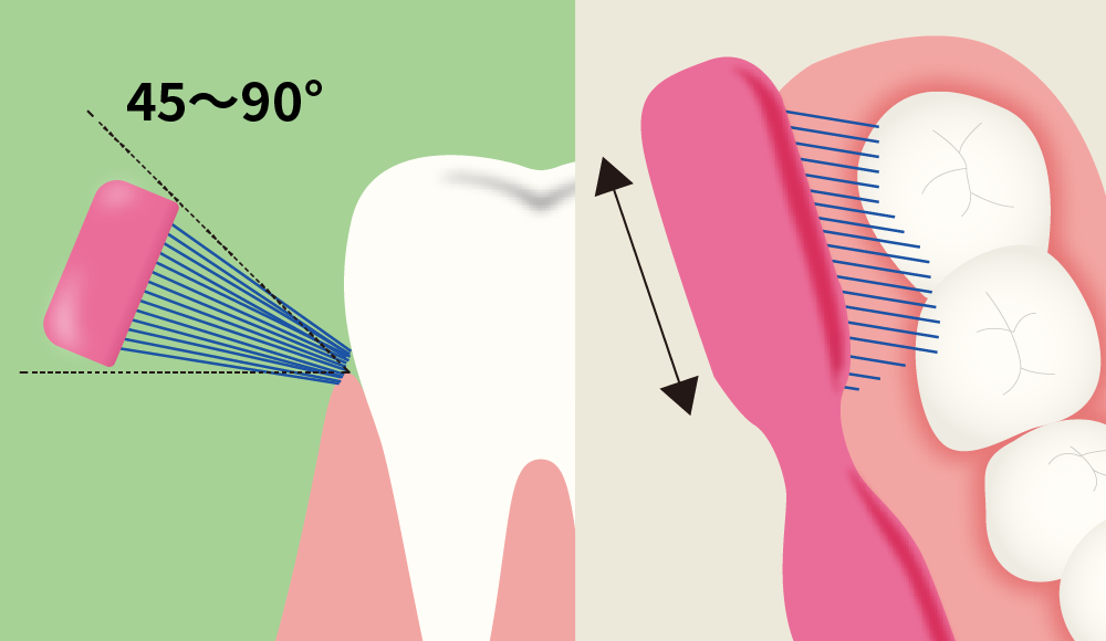 歯と歯ぐきの境に45〜90度の角度で歯ブラシの毛先を当て、小刻みに揺らすように