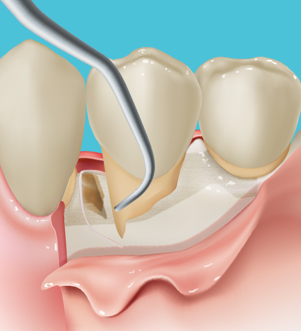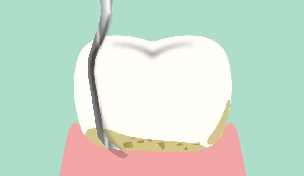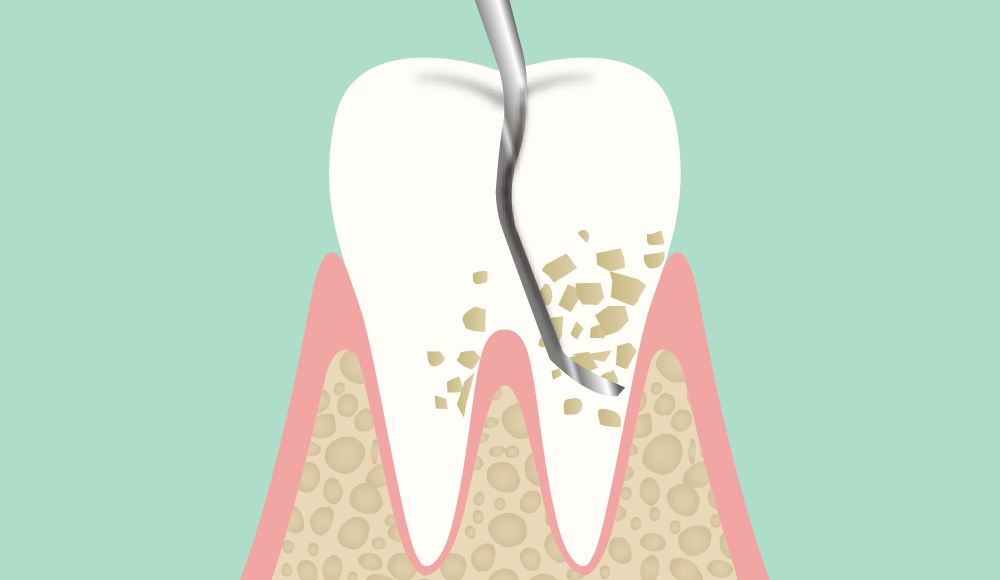 歯周ポケット内に器具を入れて、歯石や汚染された歯質を除去したうえ、歯の根の表面をきれいに磨き上げるのがルートプレーニング。歯の表面を滑らかにすることで、プラークがつきにくい状態にできます。