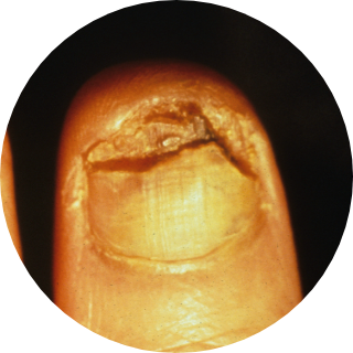 カンジダというカビの感染によるもの。多くが、爪の周りが赤くなったり厚くなったりする爪周囲の炎症を伴うカンジダ性爪囲炎だが、爪囲炎を伴わない爪のカンジダ症もある。
