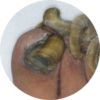 羊の角のように爪が指端を超えて縦方向に湾曲するもの。母趾爪に多い。靴の圧迫、外傷、爪水虫などによる爪床(爪の下の皮膚)の炎症や角化によって生ずる。趾先端部に何らかの隆起性病変が生じたために、爪の伸びが抑えられ、肥厚し湾曲したものと考えられている。